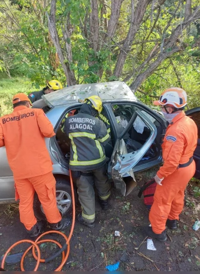 A colisão envolveu um carro de passeio que colidiu contra uma árvore.