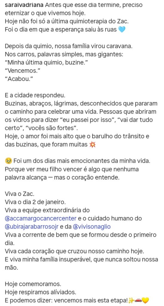 eternizar o que vivemos hoje. Hoje não foi só a última quimioterapia do Zac. Foi o dia em que a esperança saiu às ruas. Depois da quimio, nossa família virou caravana.