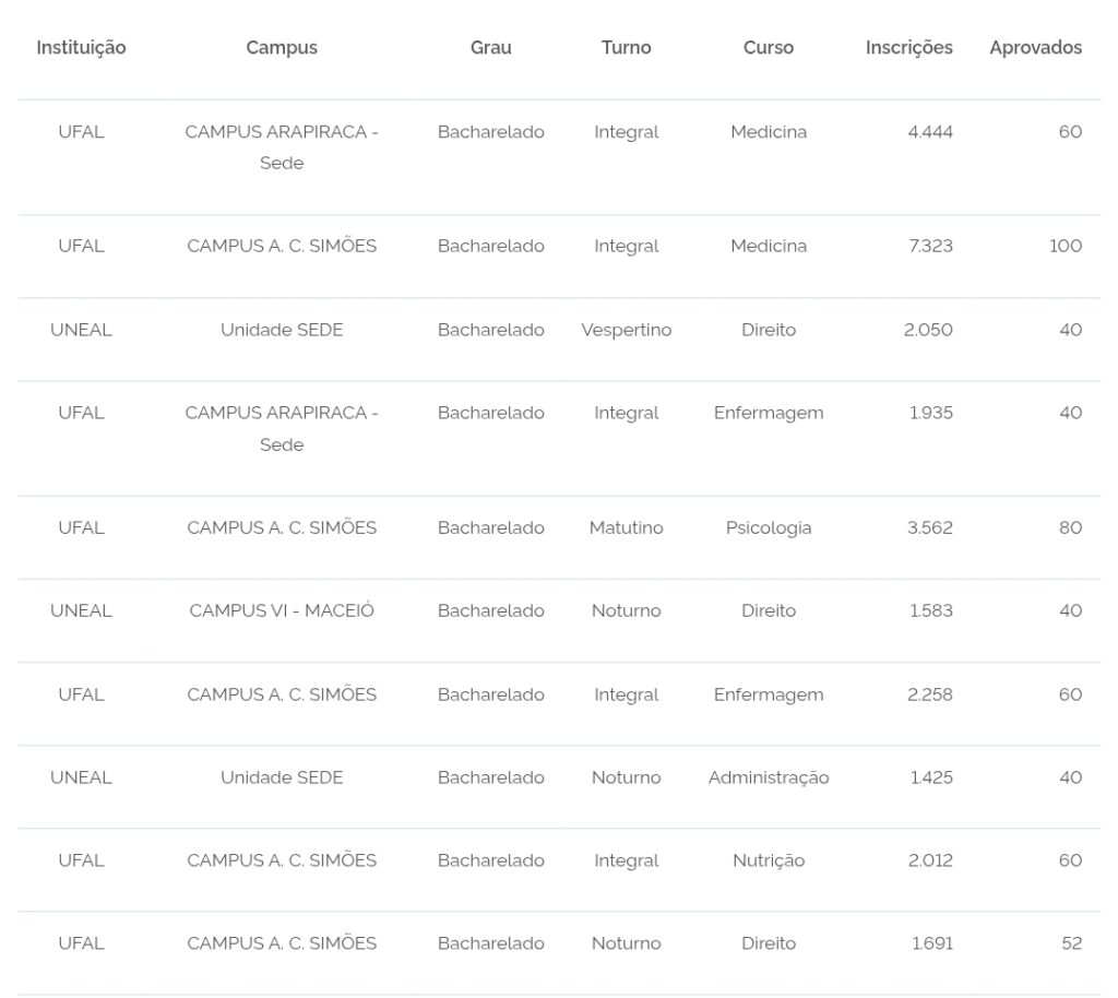 Entre as opções, o curso de bacharelado em Medicina, da Universidade Federal de Alagoas (UFAL), foi o mais concorrido.