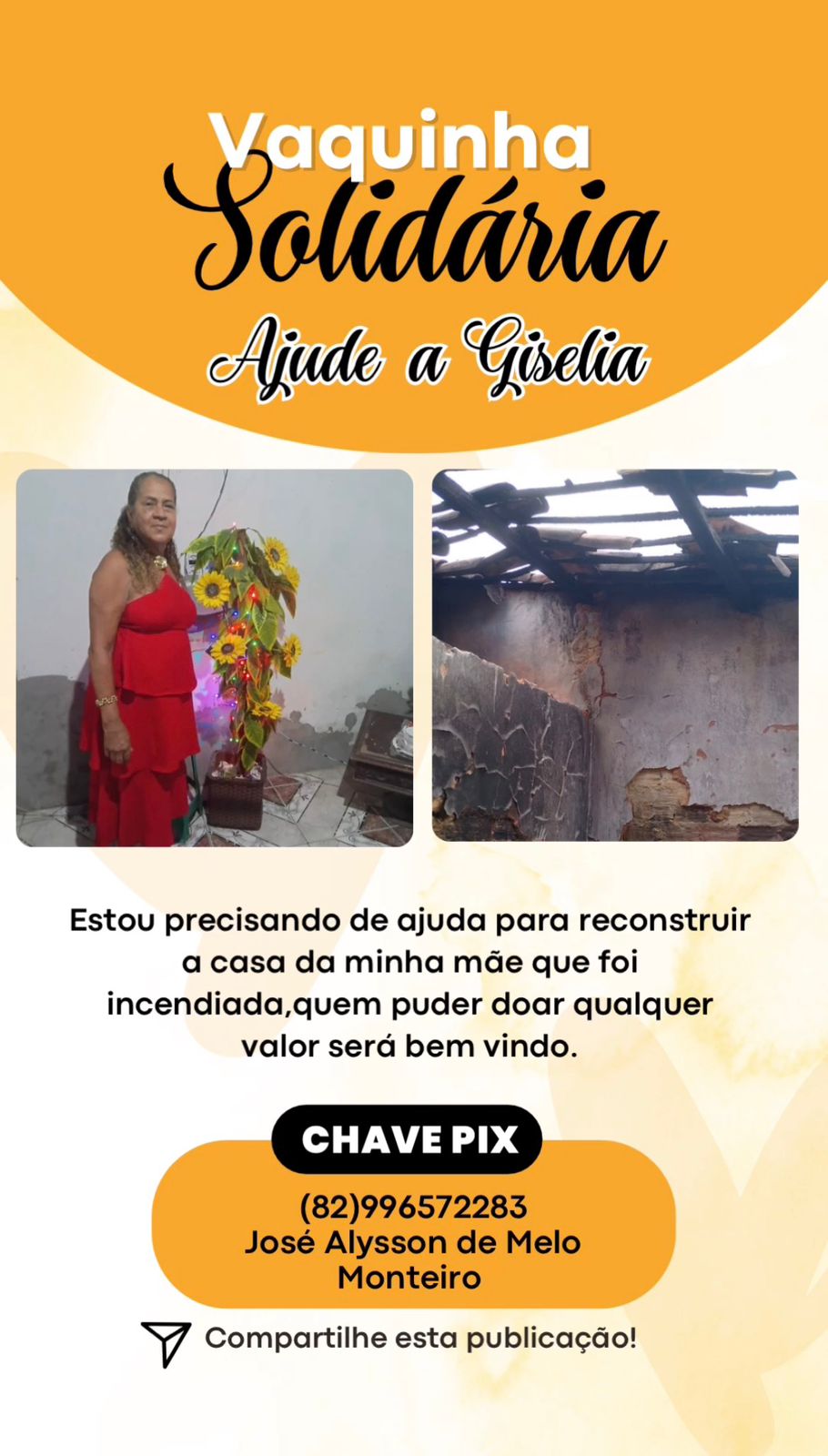 A vaquinha “Ajude a Giselia” está disponível pelo Pix: 82996572283 – em nome de José Alysson de Melo Monteiro.