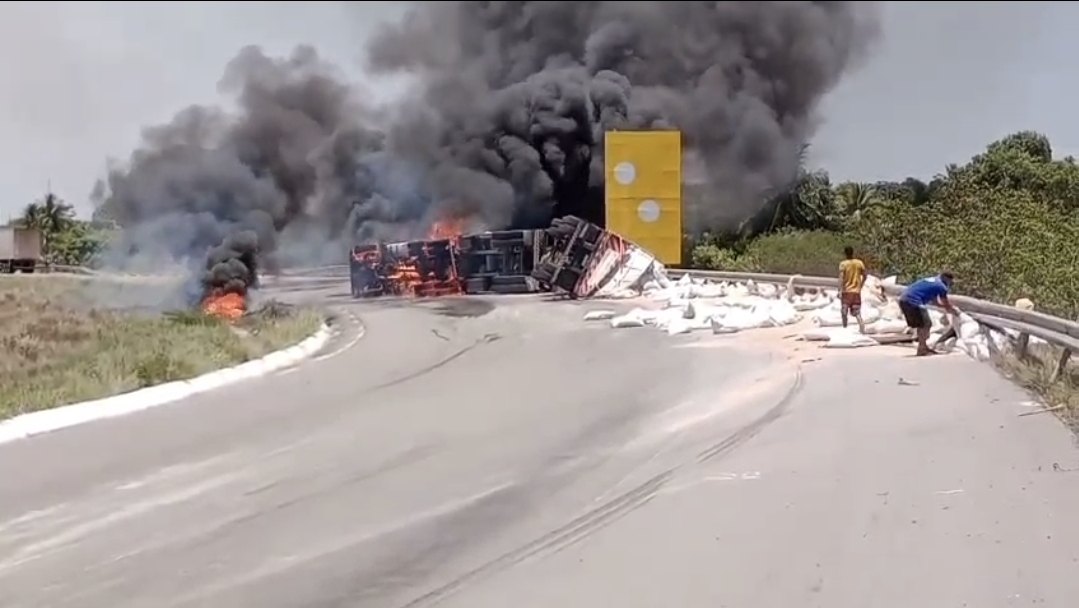Uma carreta de carga capotou e pegou fogo em Porto Real do Colégio, na ponte que liga Alagoas a Sergipe, na manhã desta terça-feira (3). Ninguém ficou ferido.