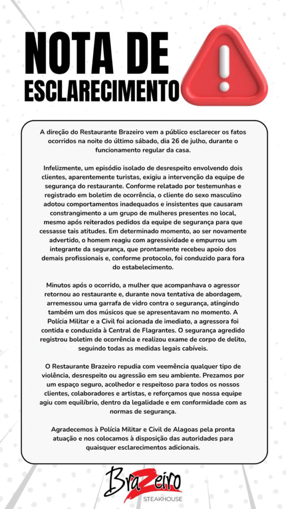 O segurança agredido fez exame de corpo de delito e registrou boletim de ocorrência. O bar informou que seguiu os protocolos e repudiou qualquer tipo de violência, ressaltando que atua para manter um ambiente seguro e respeitoso.