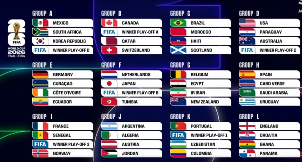 Depois, as outras nove bolinhas do pote 1 foram direcionadas para os grupos restantes. Os outros potes seguiram o modelo tradicional de sorteio, com cada time sendo sorteado para um grupo, do A ao L – sempre respeitando as restrições estabelecidas.