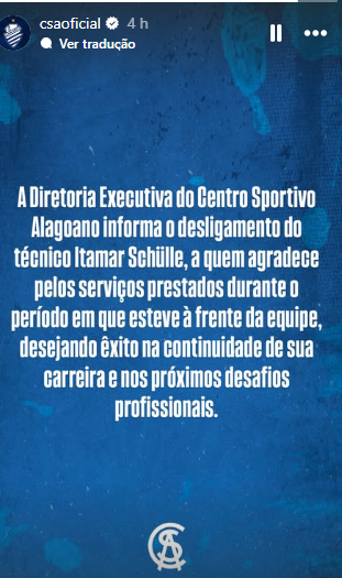 “A Diretoria Executiva do Centro Sportivo Alagoano informa o desligamento do técnico Itamar Schülle, a quem agradece pelos serviços prestados durante o período em que esteve à frente da equipe, desejando êxito na continuidade de sua carreira e nos próximos desafios profissionais.”