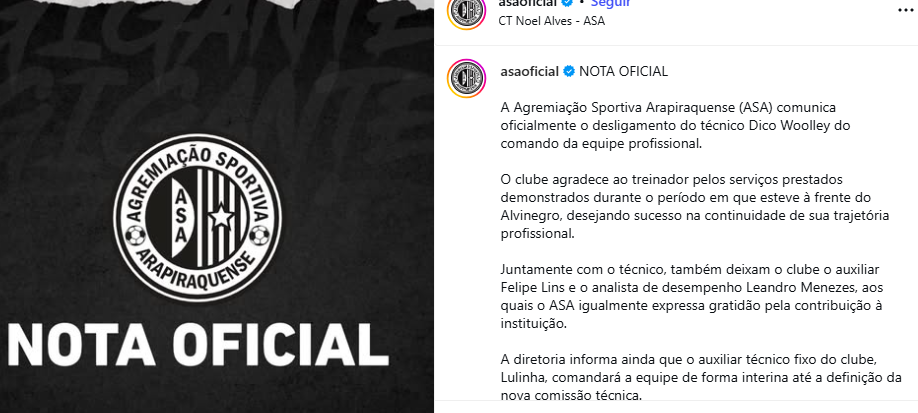 Já o ASA, publicou nota oficial no início da tarde confirmando a saída de Dico Woolley, que vem de dois resultados negativos em jogos importantes. Nesse sábado (28), o time de Arapiraca perdeu com um placar de 3 a 0 diante do CRB, no confronto de ida da final do Campeonato Alagoano.
