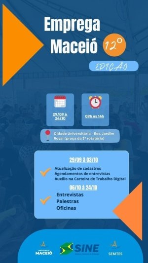 A 12ª edição do Emprega Maceió está sendo realizada na Cidade Universitária, na praça da terceira rotatória do Residencial Jardim Royal, e segue até o dia 24 de outubro. A ação, promovida pela Secretaria Municipal de Trabalho, Emprego e Economia Solidária (Semtes), acontece de segunda a sexta-feira, das 9h às 14h, oferecendo uma série de serviços e oportunidades de inserção no mercado de trabalho.