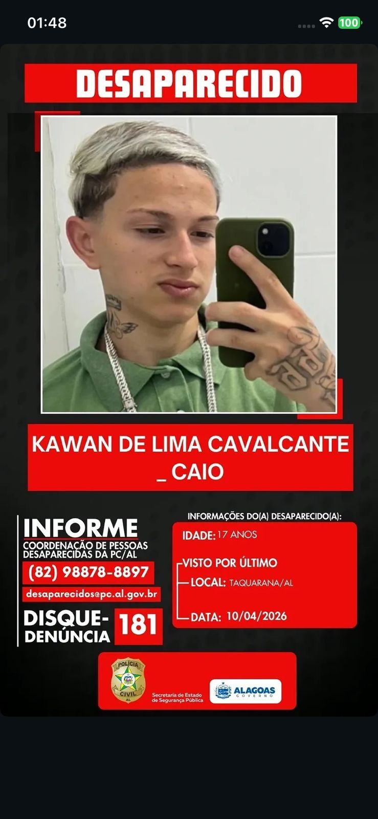 A Polícia Civil de Alagoas (PC/AL) registrou o desaparecimento do jovem Kauan de Lima Cavalcante, de 17 anos. Ele saiu de casa na última sexta-feira (10), do município de Taquarana, com destino a Arapiraca, no Agreste de Alagoas.