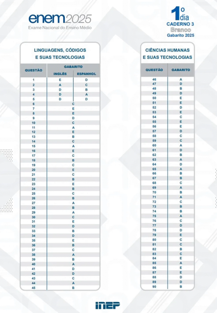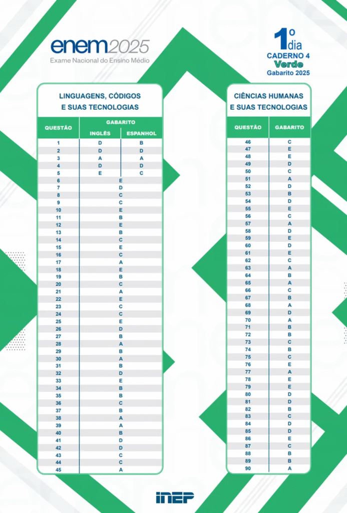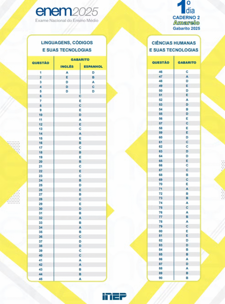 ➡️É a primeira vez que o Instituto Nacional de Estudos e Pesquisas Educacionais Anísio Teixeira (Inep) separa em duas datas a disponibilização das respostas corretas. Até 2024, o gabarito de todas as provas (Linguagens, Ciências Humanas, Ciências da Natureza e Matemática) era publicado junto, dias após o segundo domingo de Enem.