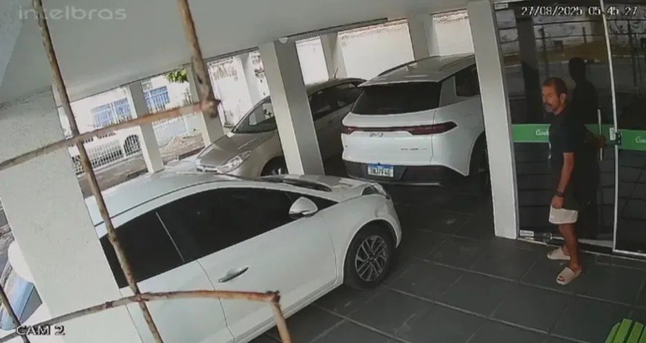 O Acta teve acesso às imagens. Nelas, é possível ver o homem pulando as grades do portão de um condomínio. Ele circula pelos carros e arromba a porta principal do prédio.