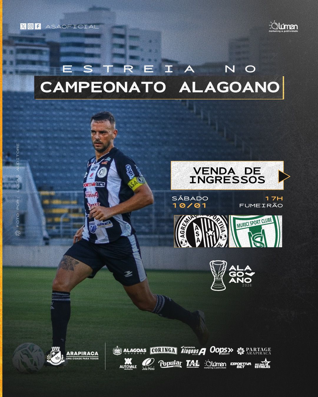Os ingressos para o jogo entre ASA e Murici, na estreia do Campeonato Alagoano 2026, no Fumeirão, em Arapiraca, estão sendo vendidos na bilheteria do estádio e na Loja do ASA, no Partage Arapiraca Shopping.