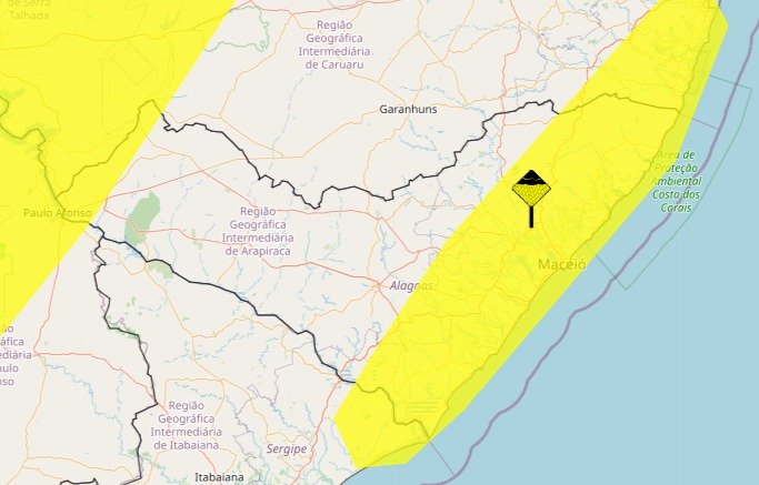 Esse aviso, válido até a manhã da sexta, cobre o Leste alagoano e aponta para a previsão de chuva entre 20 a 30 mm/h ou até 50 mm/dia.