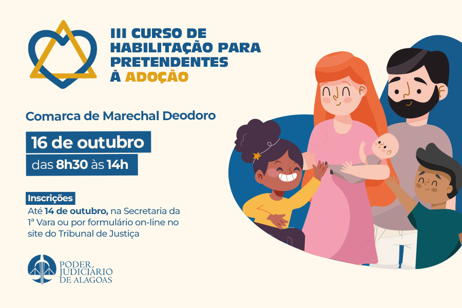 A 1ª Vara de Marechal Deodoro está com inscrições abertas para o III Curso de Habilitação para Pretendentes à Adoção, que acontecerá no dia 16 de outubro, das 8h30 às 14h, no Fórum da Comarca de Marechal Deodoro.