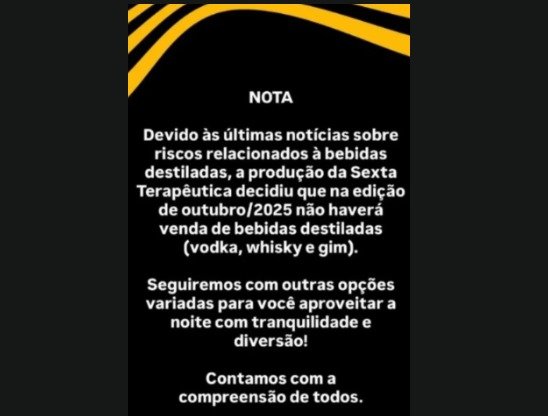 O risco de intoxicação por metanol fez com que um evento em Maceió suspendesse a venda de bebidas alcoólicas destiladas. A “Sexta Terapêutica”, marcada para a sexta-feira (3) em Jaraguá, comunicou o público sobre a decisão em nota divulgada nas redes sociais nesta quinta (2).