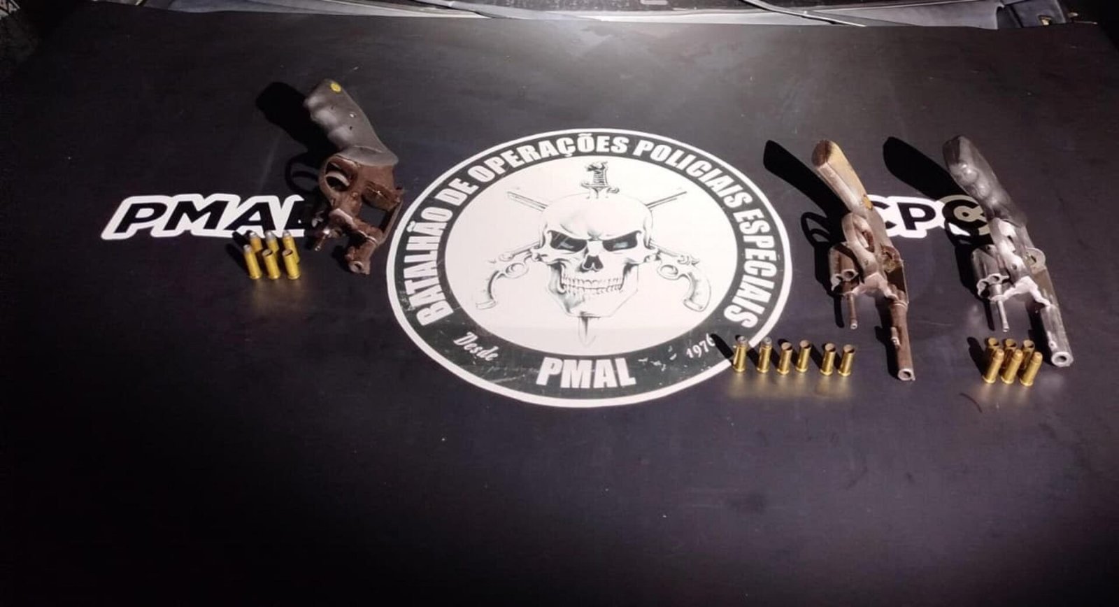 Uma ação da Polícia Militar resultou na apreensão de armas, drogas e munições na noite do sábado (25), na Grota Alvorada, bairro do Antares, em Maceió. A operação foi desencadeada após um trabalho de investigação da Diretoria de Inteligência (DINT), que identificou a realização de uma suposta festa promovida por integrantes de uma facção criminosa. Três suspeitos foram neutralizados após efetuarem disparos contra as guarnições durante as abordagens. Eles foram socorridos, mas não resistiram aos ferimentos.
