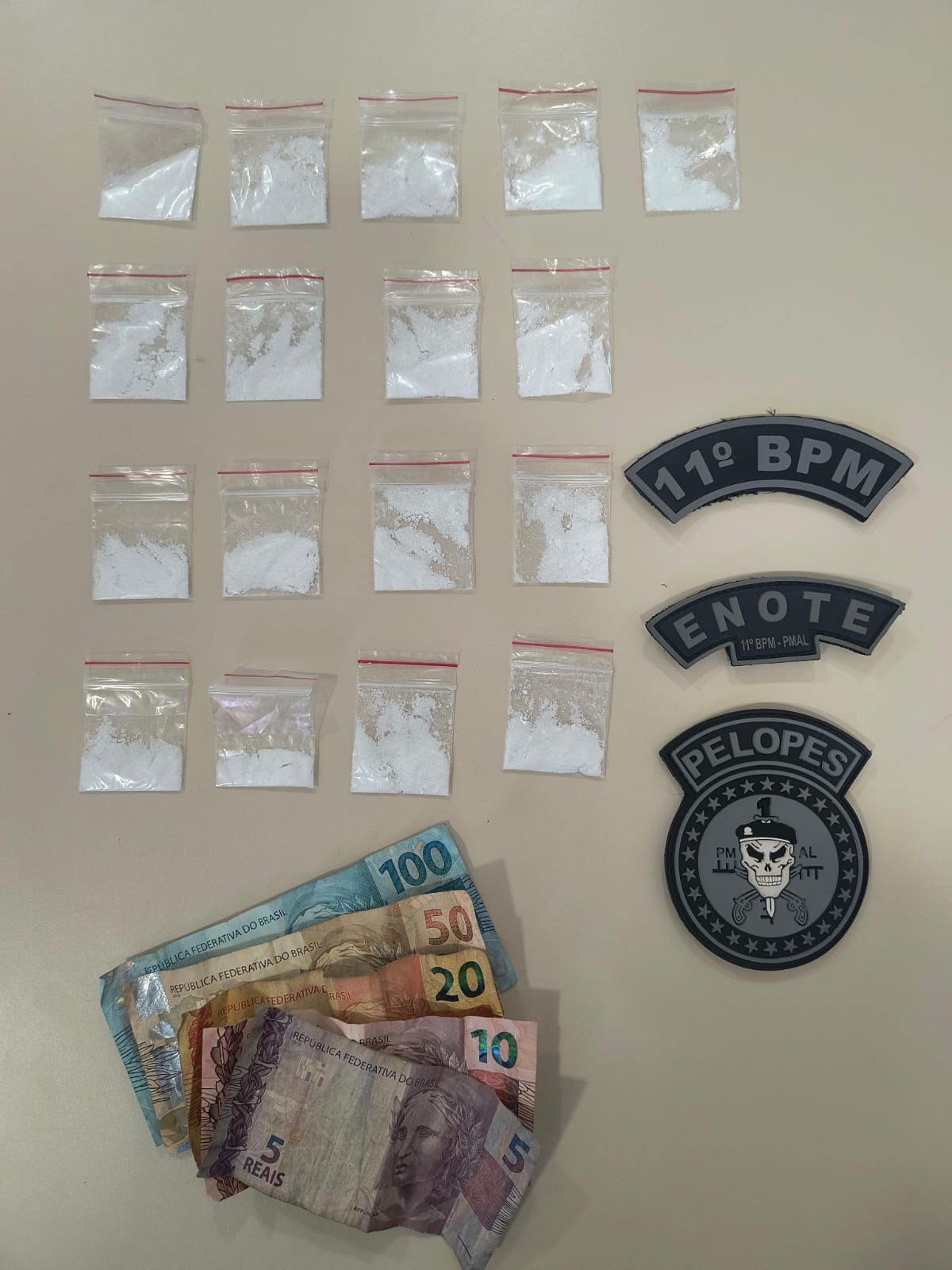 Durante a abordagem, um dos suspeitos apresentou comportamento anormal e desobedeceu à ordem de parada, continuando a caminhar. Em seguida, tentou fugir e se desfazer de um volume embalado em um saco plástico. Ele foi interceptado, e o material dispensado foi recuperado, sendo constatado tratar-se de entorpecentes fracionados para venda. Na busca pessoal, os policiais encontraram o dinheiro no bolso do suspeito, que foi conduzido à Delegacia Regional de Polícia Civil em Penedo, onde foi autuado por tráfico de drogas.