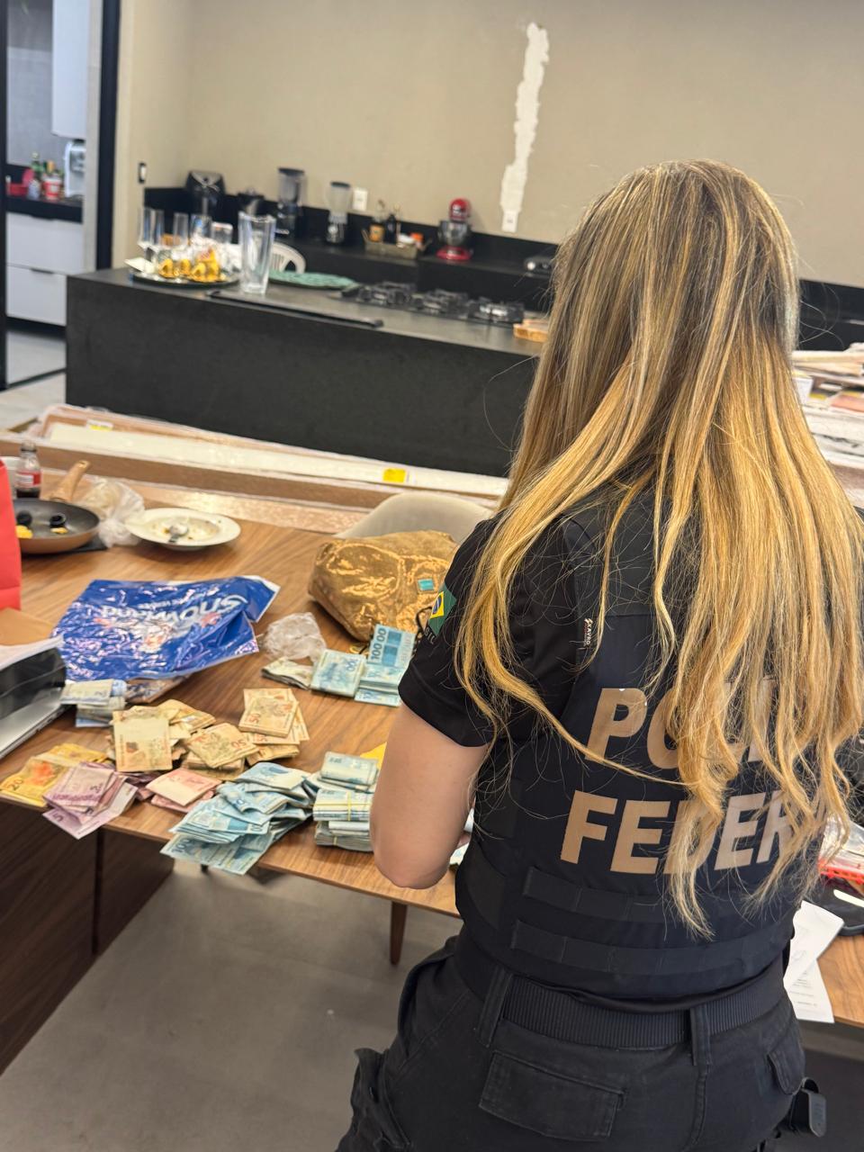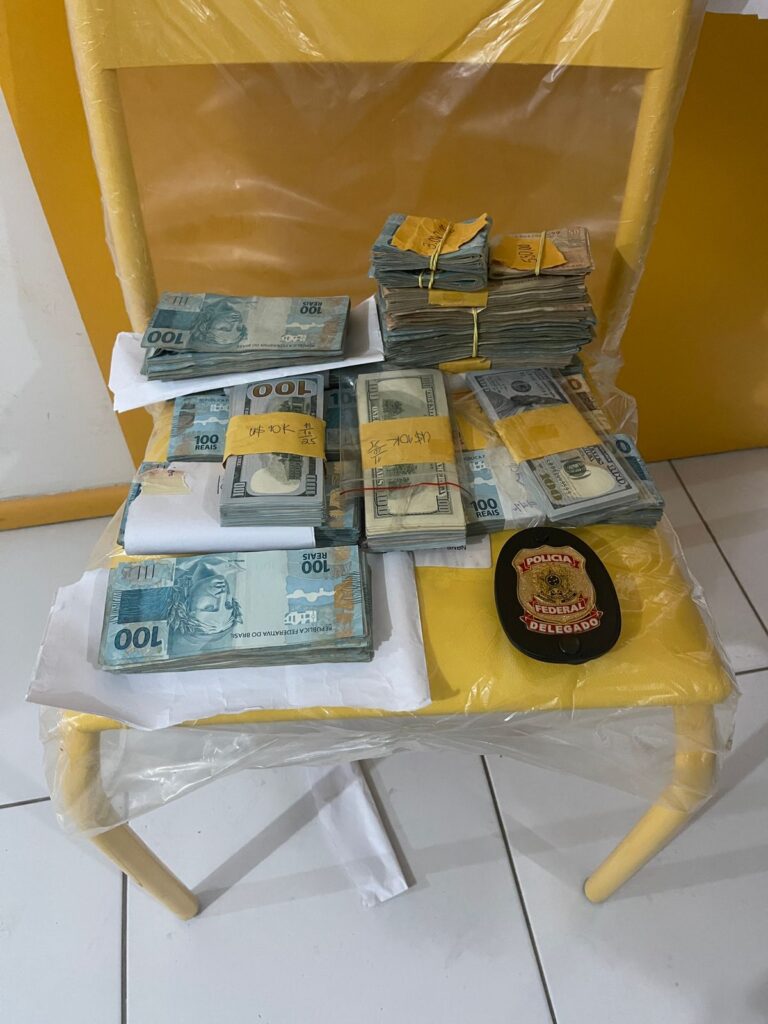 Em vários locais de busca, foi apreendida expressiva quantidade de dinheiro em espécie, em moeda nacional e estrangeira, além de 02 armas de fogo.