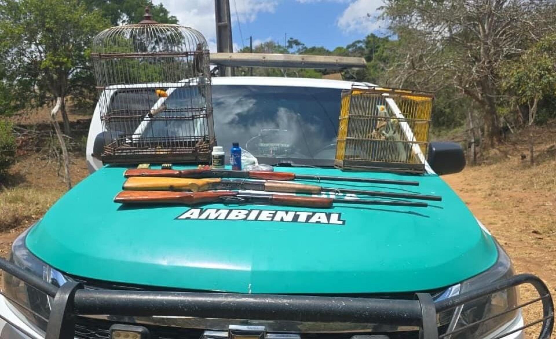 A fiscalização avançou para o interior da propriedade, onde foram localizadas outras quatro aves de espécies diversas. Questionado sobre a posse de outros materiais ilícitos, o proprietário colaborou com a equipe e revelou guardar três armas de fogo em sua residência. Foram entregues voluntariamente três espingardas, nos calibres 28, 40 e .22, além de um estojo contendo munições intactas e deflagradas.