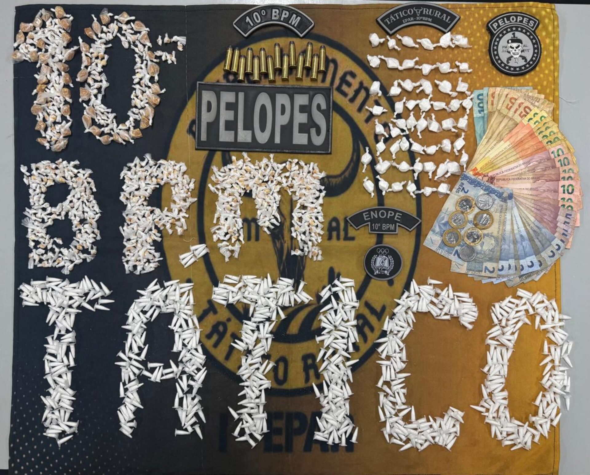 No interior da residência, a PM localizou o estoque fracionado, totalizando quase 1,5 mil porções de drogas, além de munições e valores em espécie. Todo o material foi encaminhado ao Centro Integrado de Segurança Pública (Cisp) de Palmeira dos Índios para os procedimentos cabíveis junto à Polícia Civil.