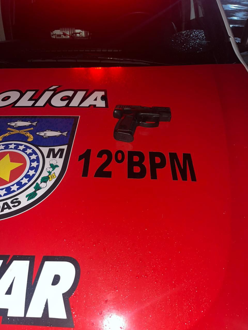 Ao chegar ao local, os militares localizaram o suspeito sentado nas proximidades de um churrasquinho. Durante a abordagem e a busca pessoal, foi encontrada com ele uma pistola calibre .380 (modelo 638 Pro SA), com a numeração suprimida, além de 11 munições intactas.