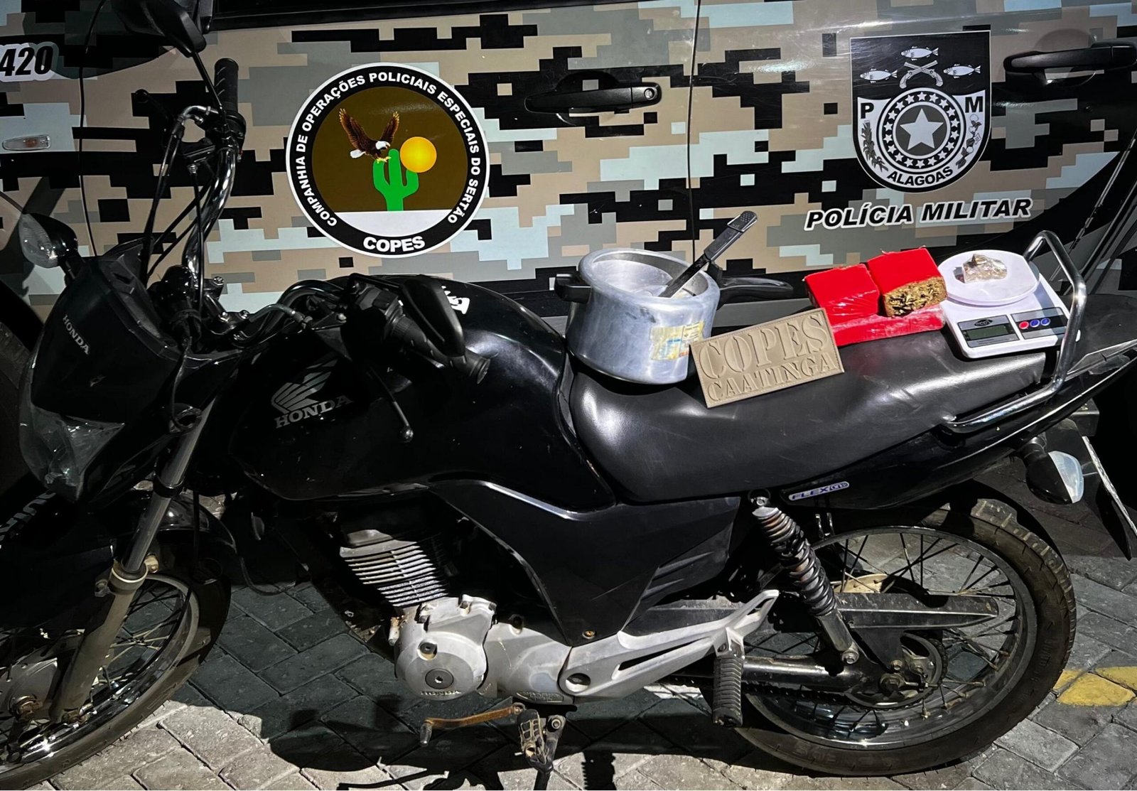 Militares da Companhia Independente de Operações Policiais Especiais do Sertão (Copes) registraram um flagrante de tráfico de drogas no município de Dois Riachos. Um indivíduo do sexo masculino de 27 anos foi preso. Na ação, uma motocicleta Honda CG 150 Start de cor preta foi apreendida juntamente com uma quantidade de maconha. Cerca de um quilo da droga estava escondido em uma panela de pressão e outros 26g estavam no bolso do abordado. Uma balança de precisão também foi recolhida.