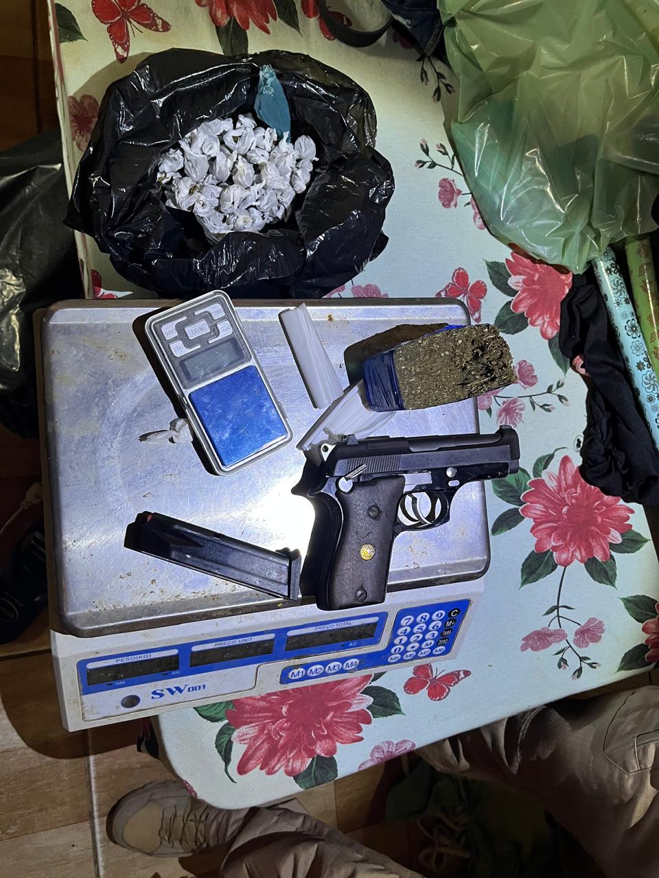 Durante o cumprimento dos mandados de prisão, busca e apreensão, foram encontrados e apreendidos na residência do autor diversos objetos ilícitos: duas armas de fogo (uma pistola e um revólver), munições, grande quantidade de drogas, inclusive drogas já embaladas para a comercialização e uma balança de precisão.
