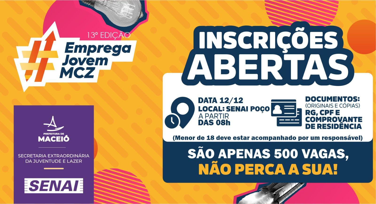 A Prefeitura de Maceió, em parceria com o Senai, abre nesta sexta-feira (12) as inscrições para a 13ª edição do Programa Emprega Jovem. A iniciativa é coordenada pela Secretaria Extraordinária da Juventude e Lazer (SEJL) e oferece 500 vagas em cursos gratuitos voltados à formação e qualificação profissional de jovens e adultos maceioenses, ampliando as oportunidades de inserção no mercado de trabalho. As inscrições acontecem a partir das 8h, no Senai do Poço, com atendimento por ordem de chegada. Para participar, é necessário ter a partir de 14 anos, sem limite máximo de idade. Menores de 18 anos devem estar acompanhados de um responsável com documento oficial com foto. Os candidatos devem apresentar RG, CPF e comprovante de residência, originais e cópias.
