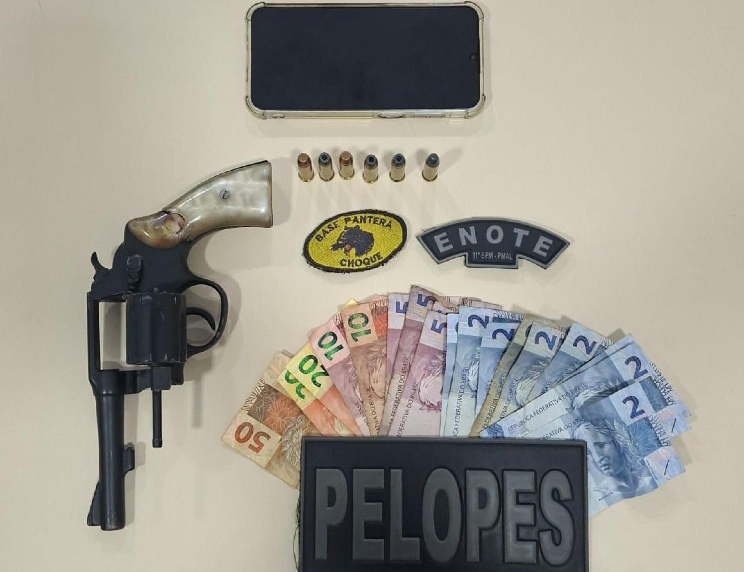 Legenda: Durante as diligências, um revólver calibre 38, munições, celular e dinheiro foram apreendidos pela PM