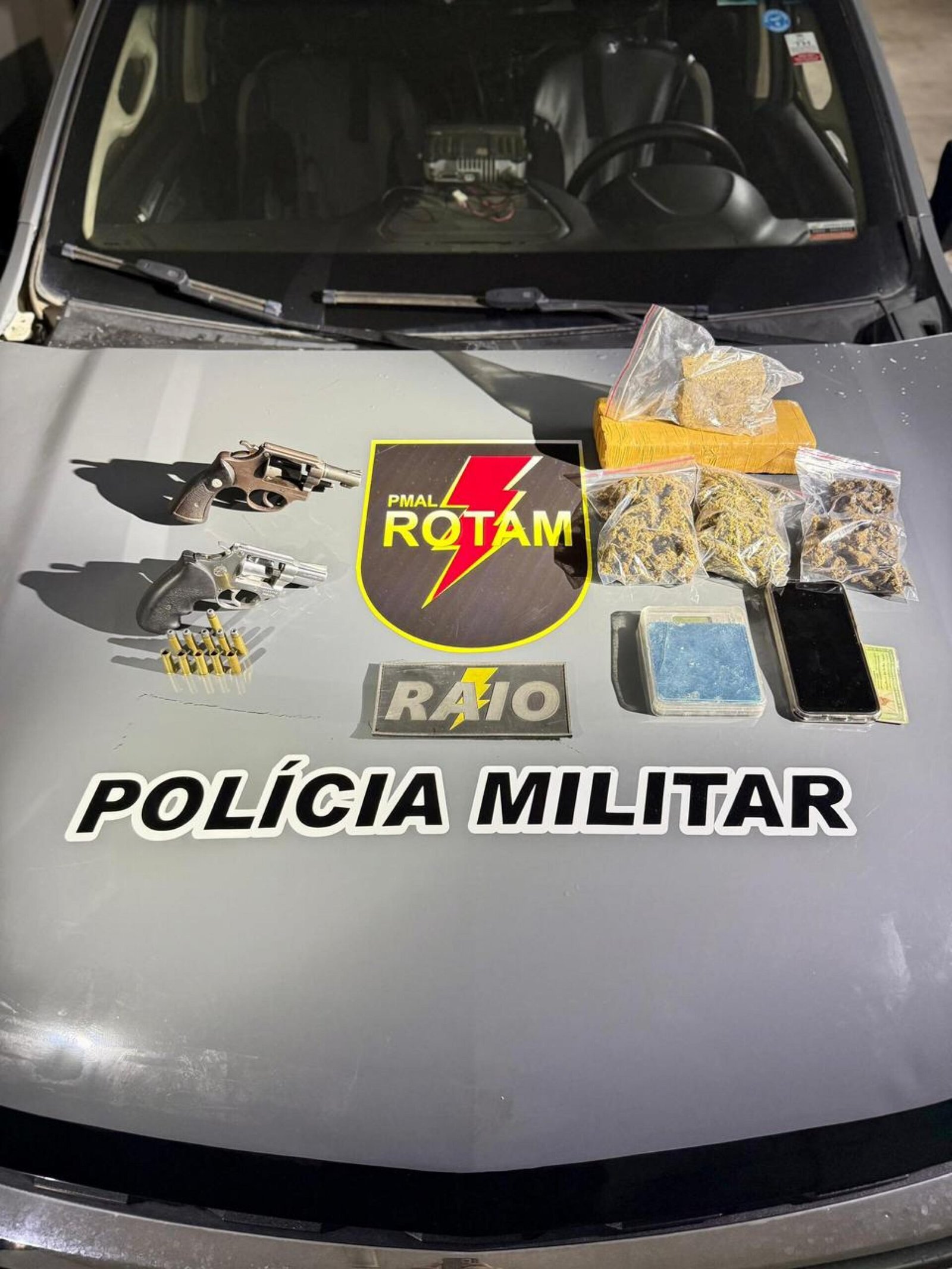 Equipes do Batalhão de Rotam, com o apoio da Companhia Raio, apreenderam duas armas de fogo, uma balança de precisão e uma quantidade de maconha durante ação na noite de quarta-feira (8), no bairro Barro Duro, em Maceió.