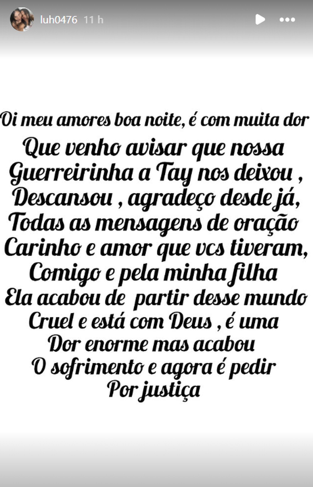 “É com muita dor que venho avisar que nossa guerreirinha, a Tay, nos deixou. Descansou”, destacou a mãe, em post nos stories do Instagram. “Ela acabou de partir desse mundo cruel e está com Deus. É uma dor enorme, mas acabou o sofrimento, e agora é pedir por justiça”.