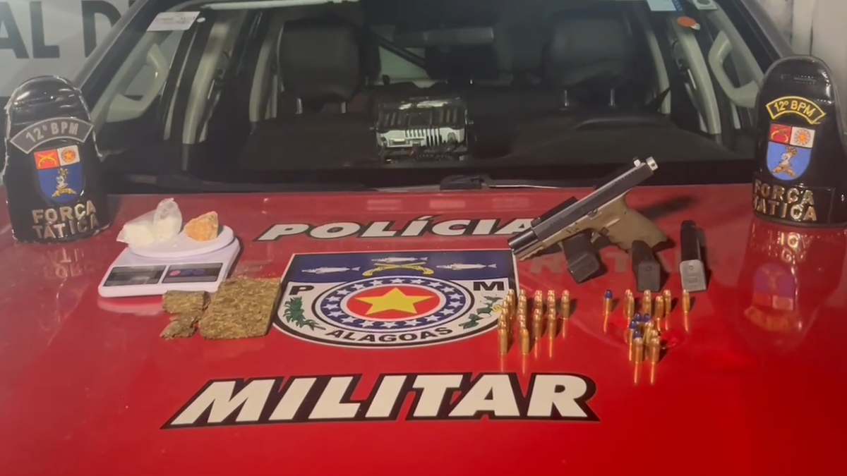 uma pistola,40 munições, 180g de maconha, 38g de cocaína, 25g de crack, além da chave de um veículo roubado, posteriormente localizado.