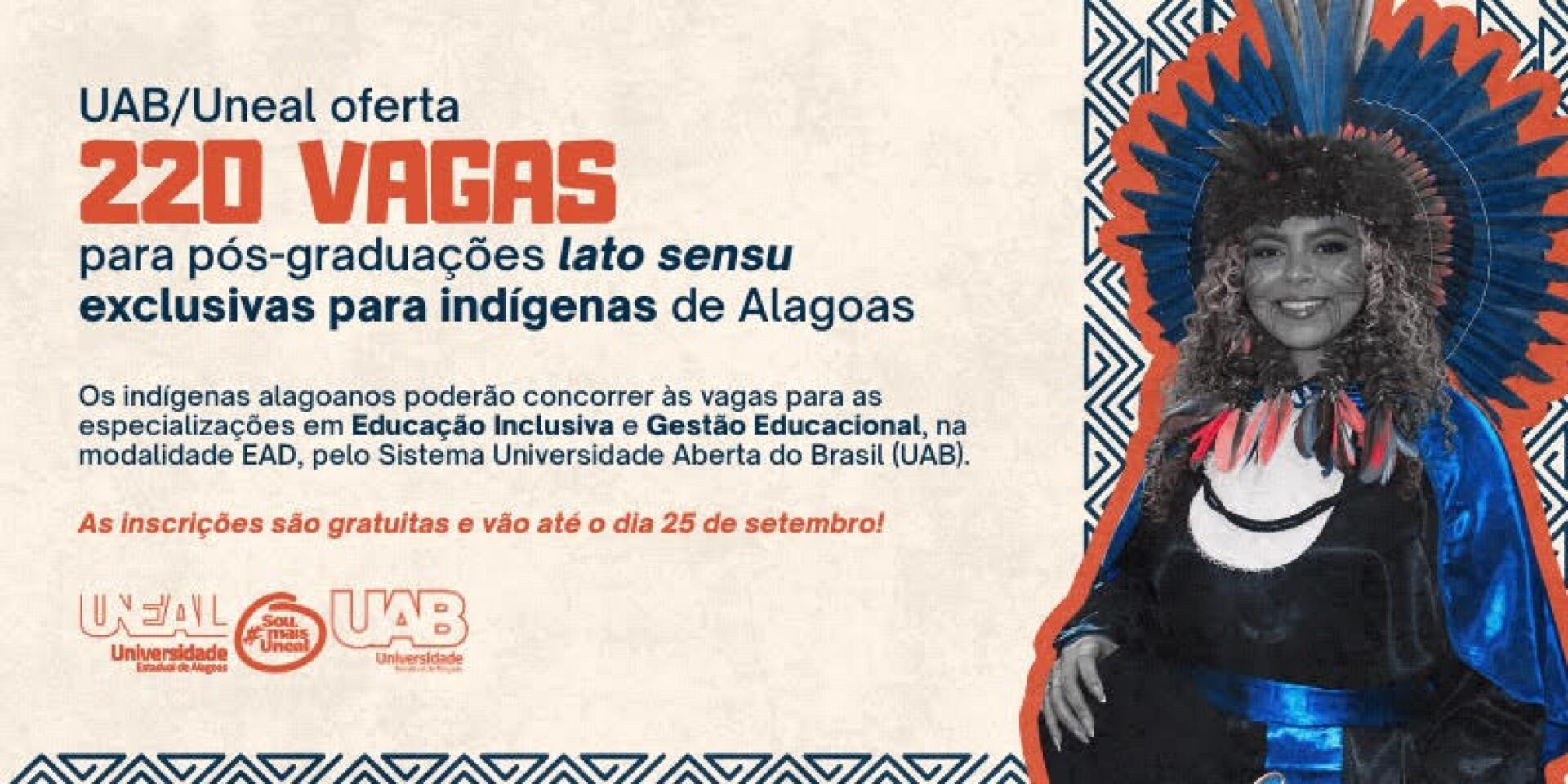 Os indígenas alagoanos poderão concorrer às vagas para as especializações em Educação Inclusiva e Gestão Educacional, na modalidade EaD, pelo Sistema Universidade Aberta do Brasil (UAB), em parceria com a Universidade Estadual de Alagoas (Uneal). Estão sendo ofertadas 220 vagas, distribuídas nos polos de Teotônio Vilela e Piranhas.