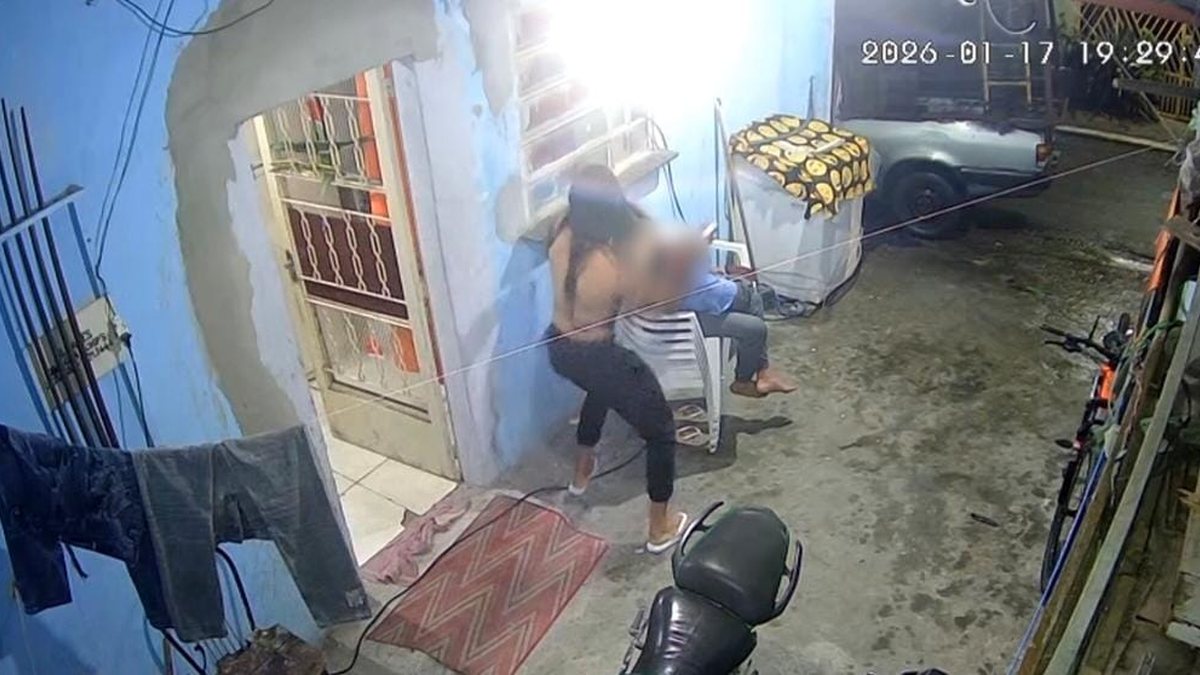 Imagens de câmeras de segurança mostram a vítima sentada dentro da residência, utilizando o celular, com o filho no colo. Em seguida, a suspeita aparece entrando no imóvel e indo em direção à cozinha. Logo depois, ocorre o ataque.