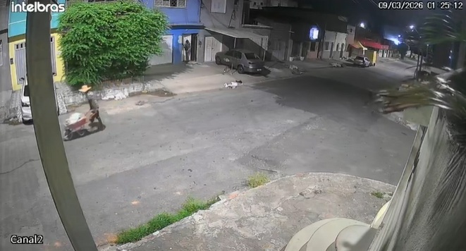 As imagens mostram um casal, aparentemente em situação de rua, circulando pela via antes do crime. No primeiro registro, feito por volta de 00h45, um homem usando boné vermelho aparece caminhando pela rua, enquanto uma mulher, com chapéu azul, surge ao fundo da imagem.