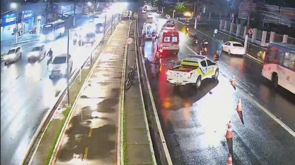 O acidente ocorreu por volta das 20h42 e foi registrado por câmeras de monitoramento da Secretaria de Segurança Pública (SSP). Nas imagens, é possível ver que a vítima atravessava fora da faixa de pedestres, no sentido Centro, quando foi atingida em cheio pela moto.