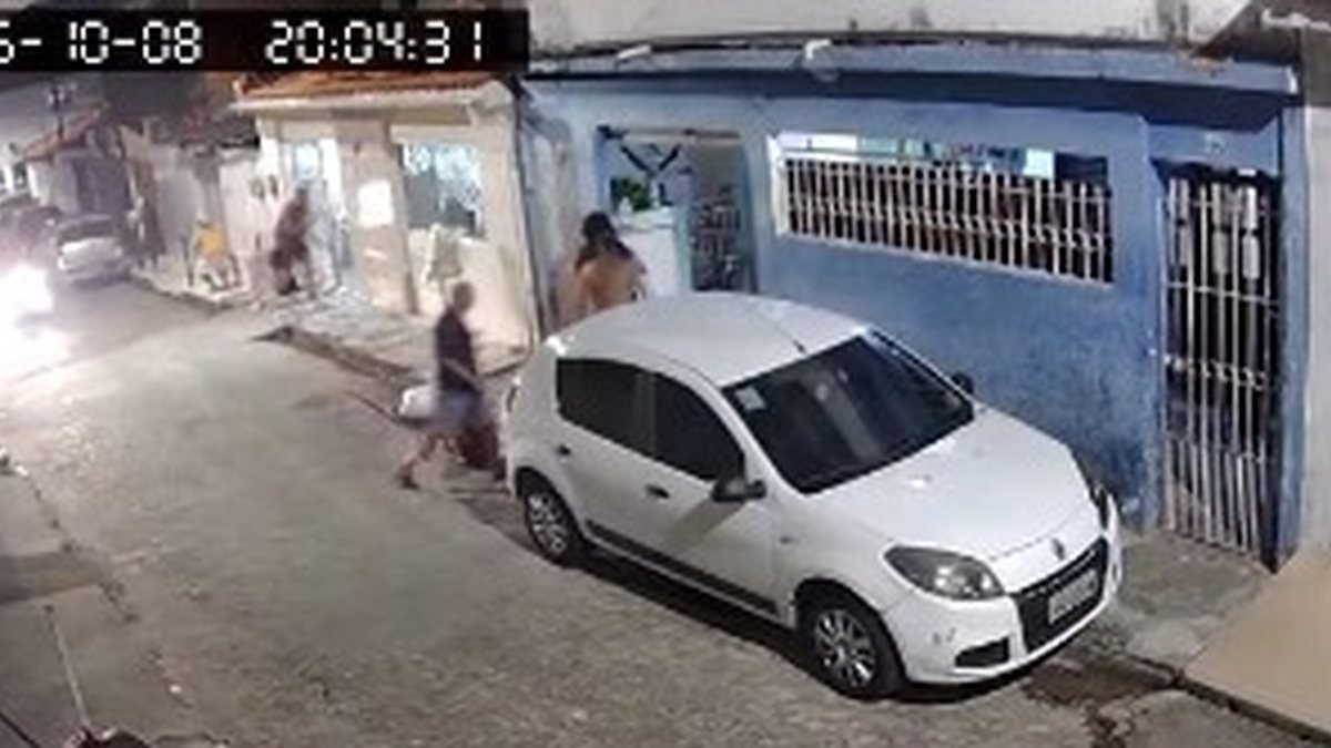 Câmeras de segurança registraram o momento do ataque, permitindo ouvir o barulho de cinco tiros. As imagens também mostram moradores assustados correndo para dentro das casas.