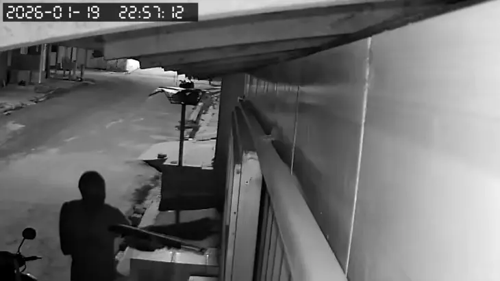 O vídeo também registra o momento em que duas pessoas estavam sentadas em uma calçada quando o grupo armado passa correndo pelo local. Ao perceberem a ação criminosa, os jovens correm para dentro de uma residência, conseguindo escapar da situação.
